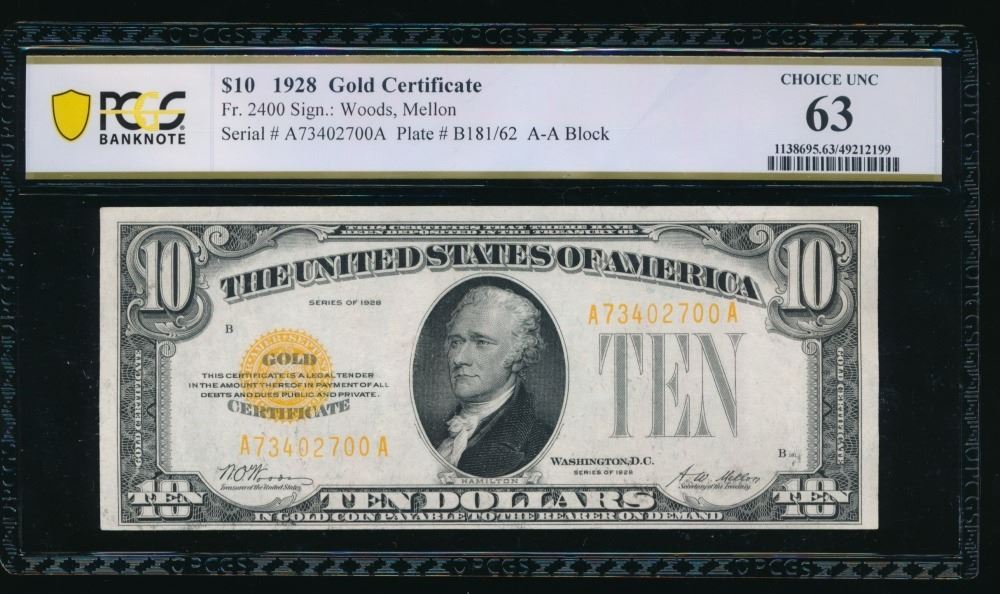 One 1928 $10 Gold Certificate PCGS 63.