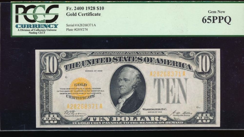 One 1928 $10 Gold Certificate PCGS 65PPQ.