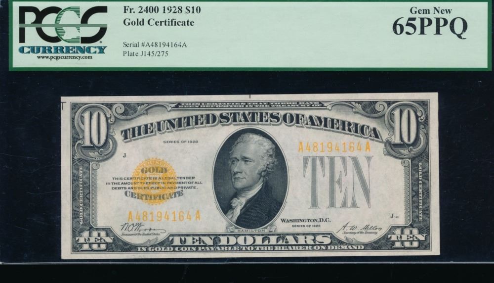 One 1928 $10 Gold Certificate PCGS 65PPQ.