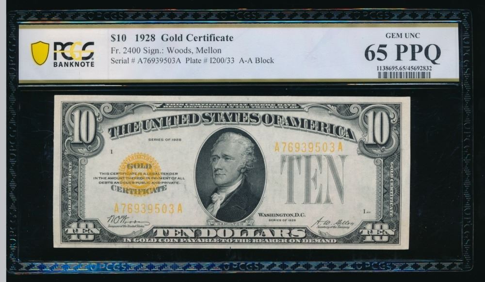 One 1928 $10 Gold Certificate PCGS 65PPQ.