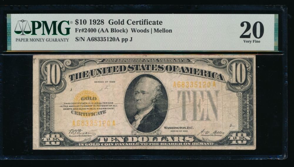 One 1928 $10 Gold Certificate PMG 20.