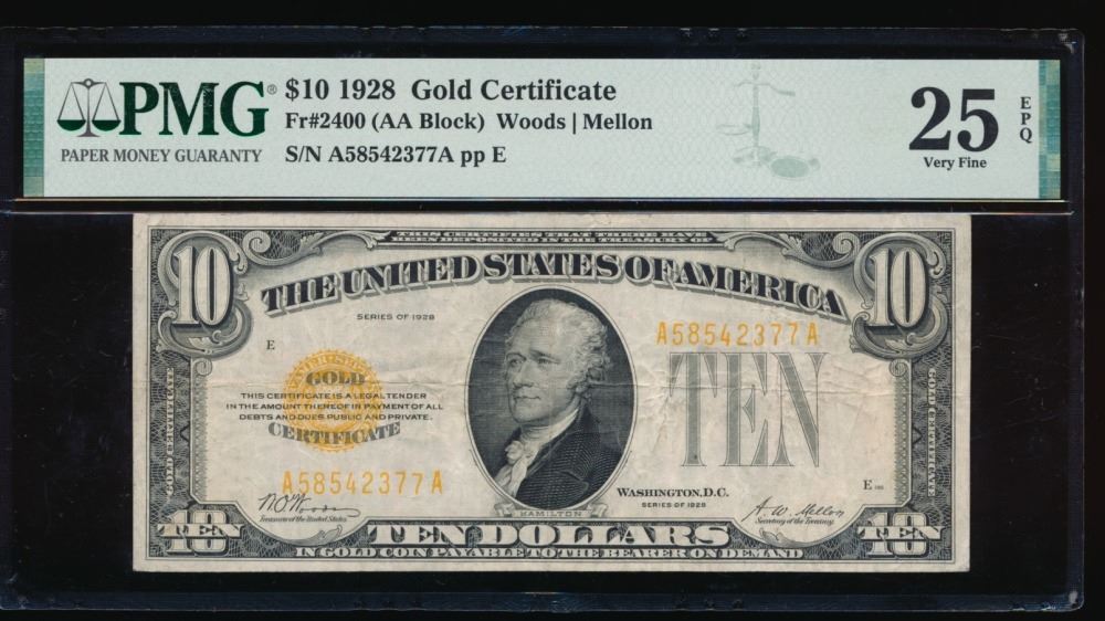 One 1928 $10 Gold Certificate PMG 25EPQ.
