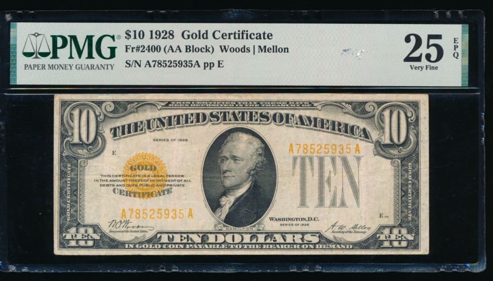 One 1928 $10 Gold Certificate PMG 25EPQ.