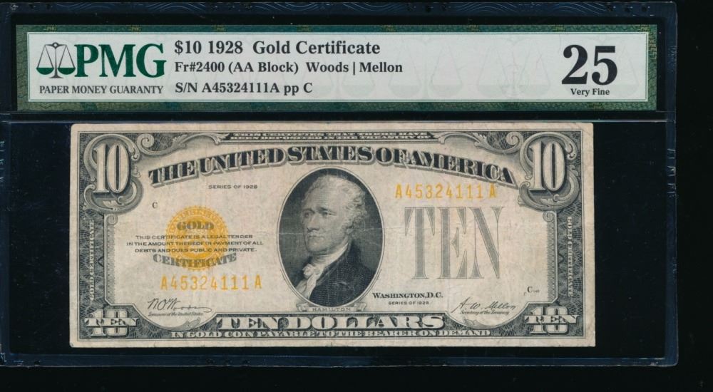 One 1928 $10 Gold Certificate PMG 25.