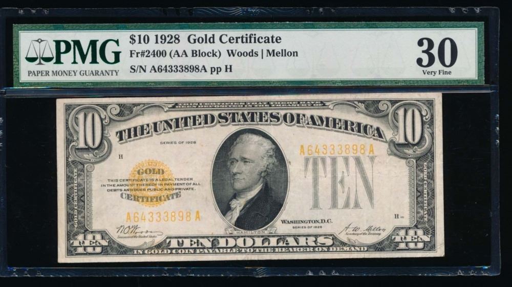 One 1928 $10 Gold Certificate PMG 30.