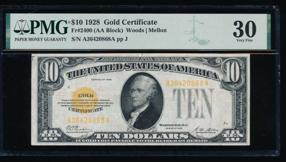 One 1928 $10 Gold Certificate PMG 30.