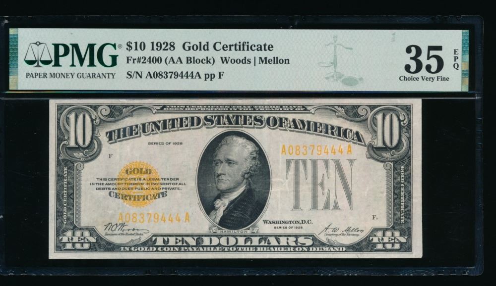 One 1928 $10 Gold Certificate PMG 35EPQ.