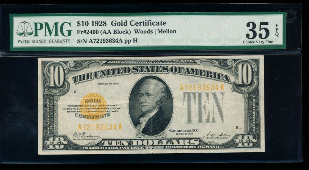 One 1928 $10 Gold Certificate PMG 35EPQ.