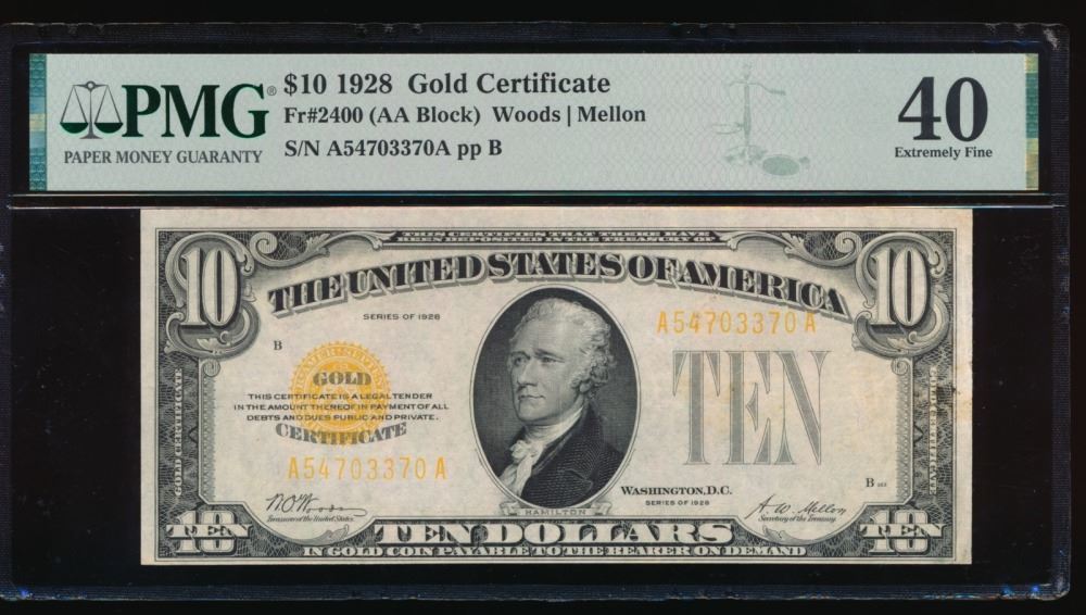 One 1928 $10 Gold Certificate PMG 40.