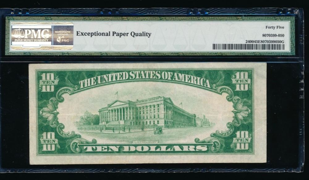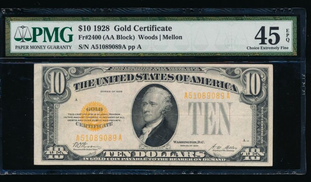 One 1928 $10 Gold Certificate PMG 45EPQ.