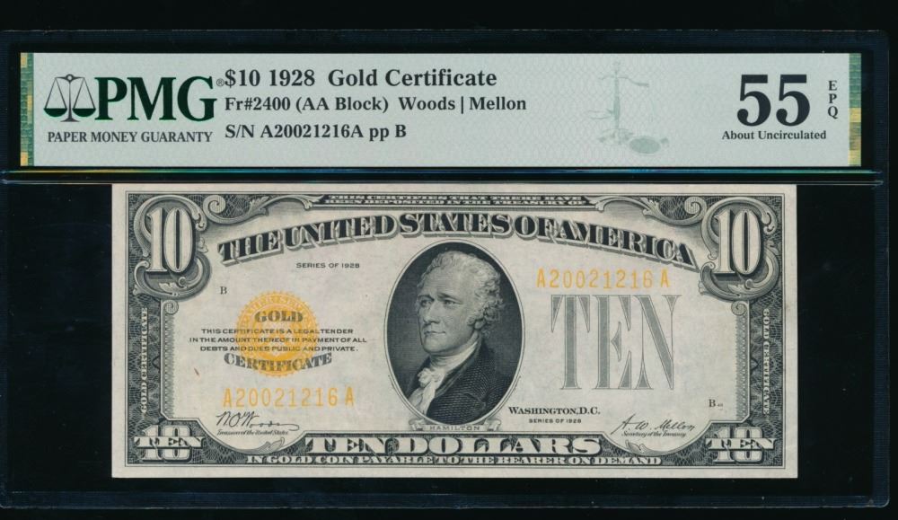 One 1928 $10 Gold Certificate PMG 55EPQ.