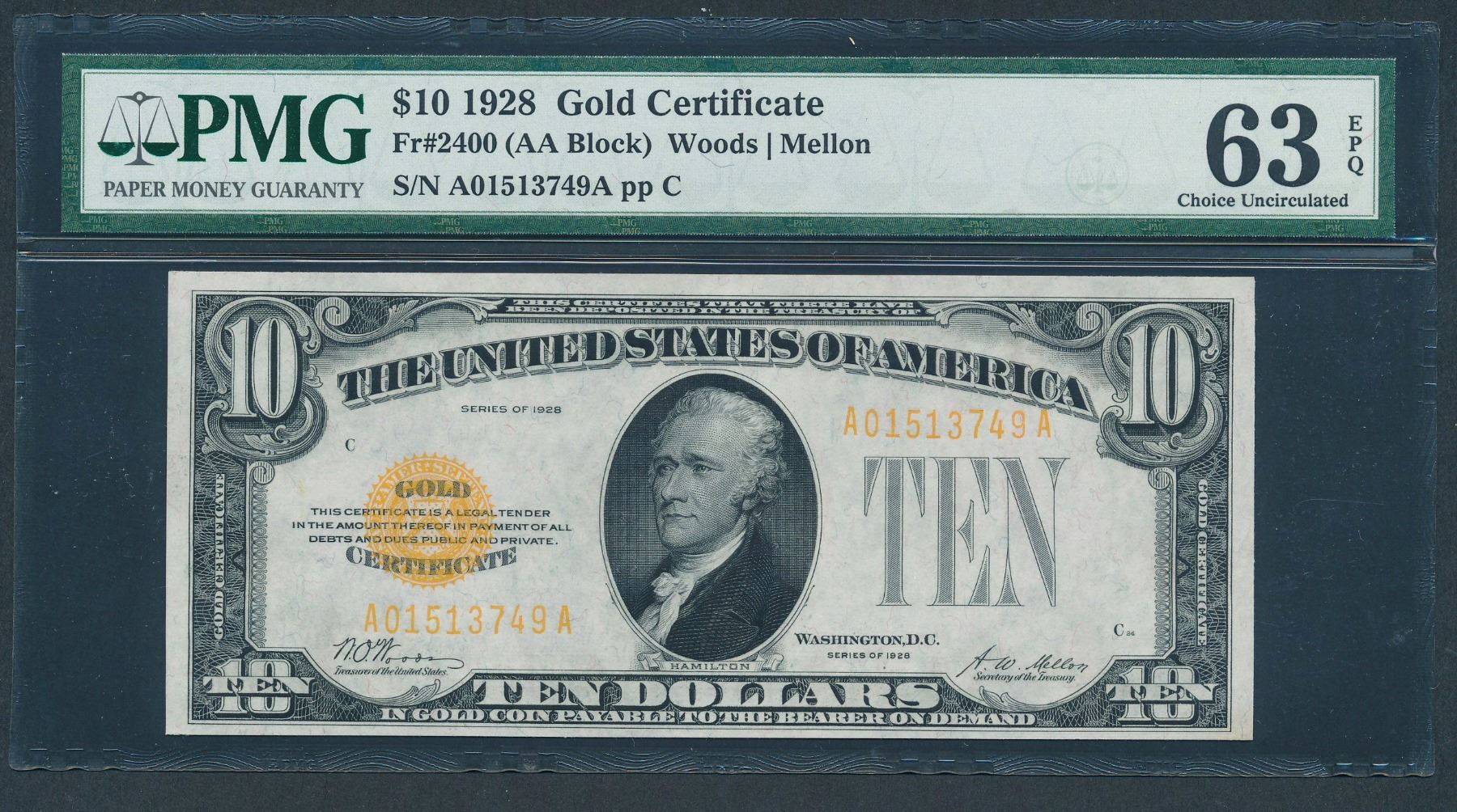One 1928 $10 Gold Certificate PMG 63EPQ.