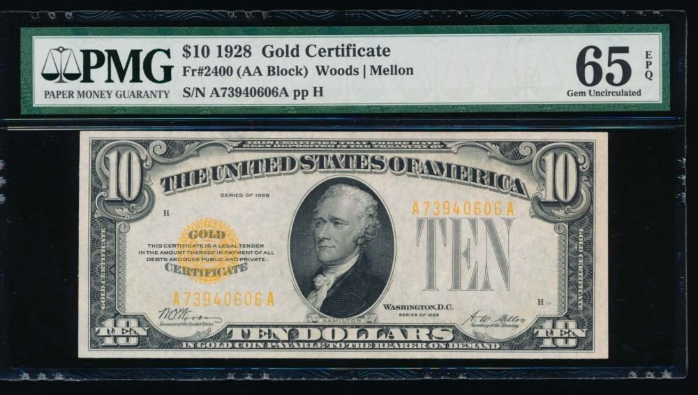 One 1928 $10 Gold Certificate PMG 65EPQ.