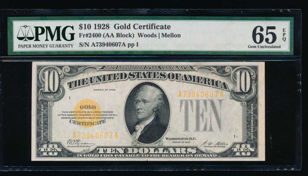 One 1928 $10 Gold Certificate PMG 65EPQ.