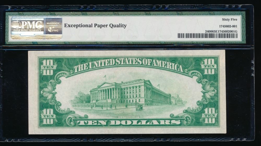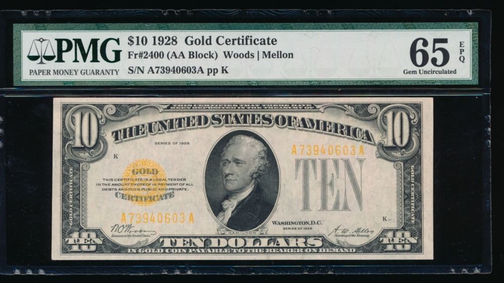 One 1928 $10 Gold Certificate PMG 65EPQ.