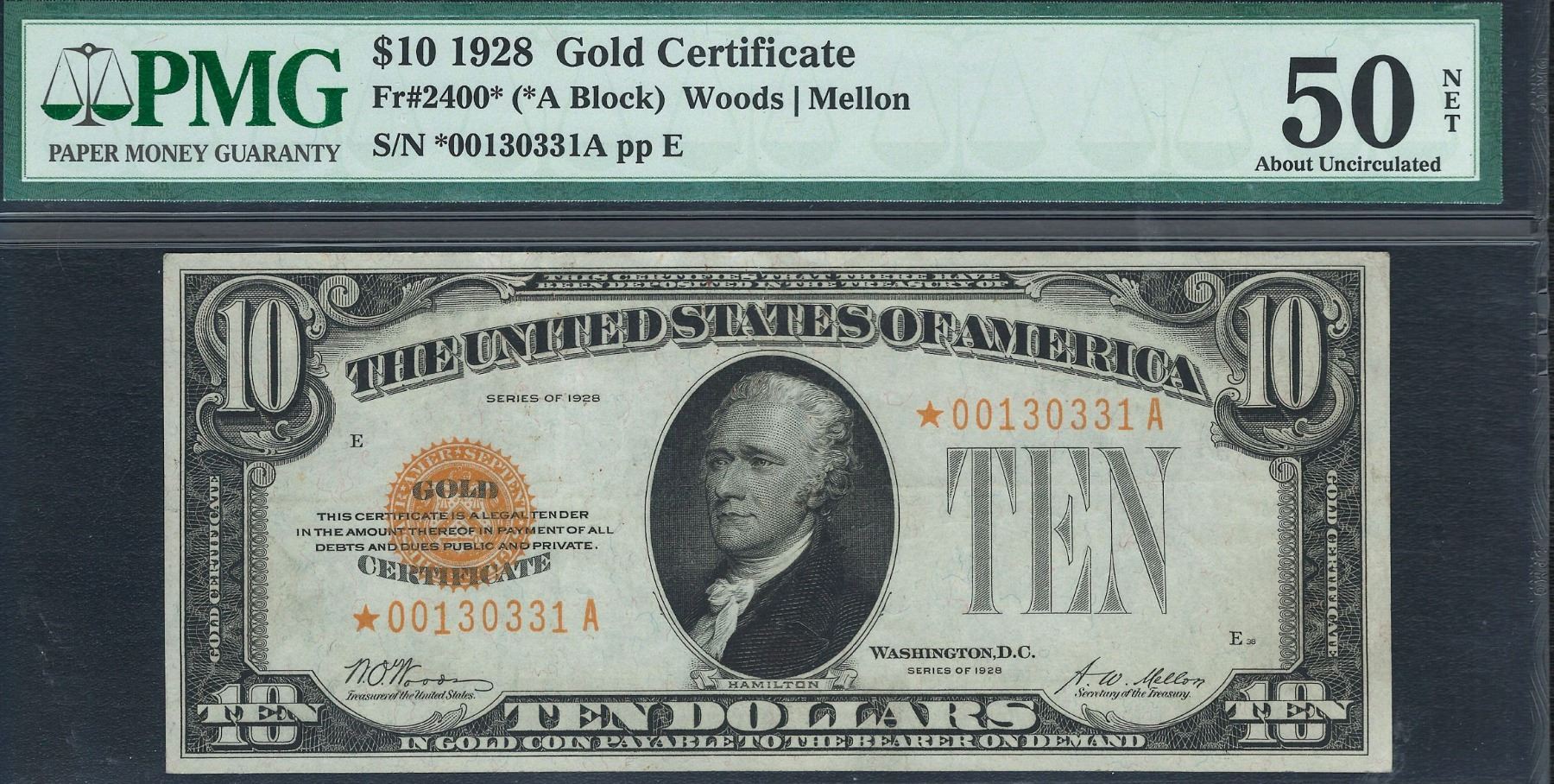 One 1928 $10 Gold Certificate Star Note PMG 50NET.