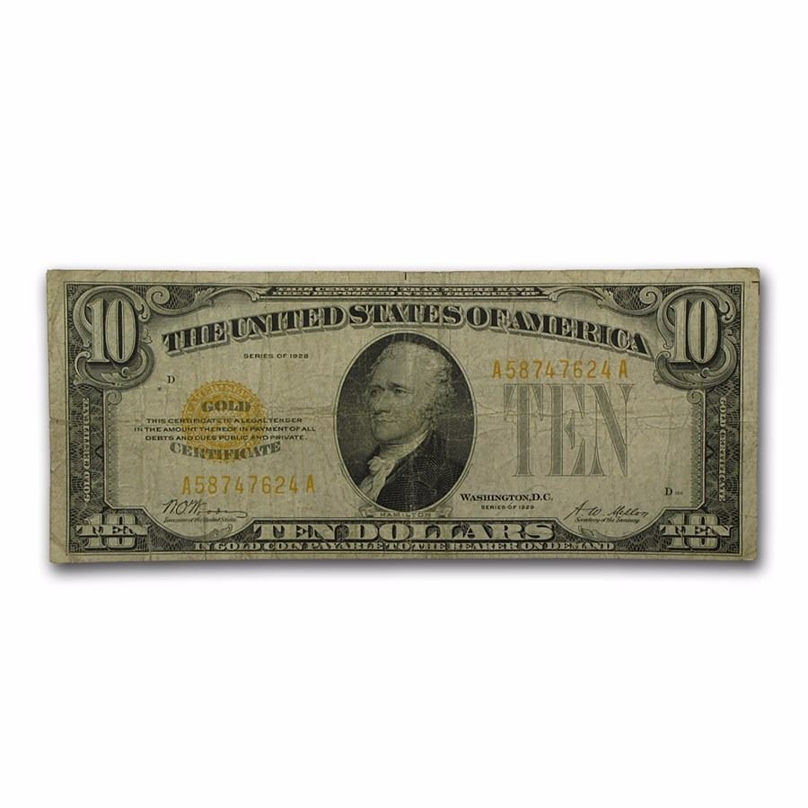 1928 $10 Gold Certificate almost 100 YEAR OLD GOLD CURRENCY