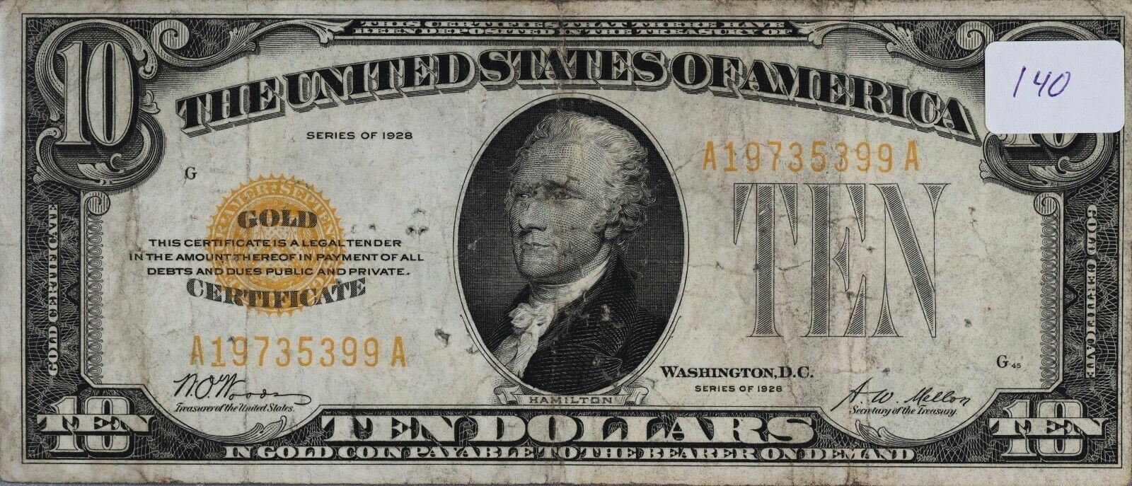 1928 $10 Gold Certificate almost 100 YEAR OLD GOLD CURRENCY