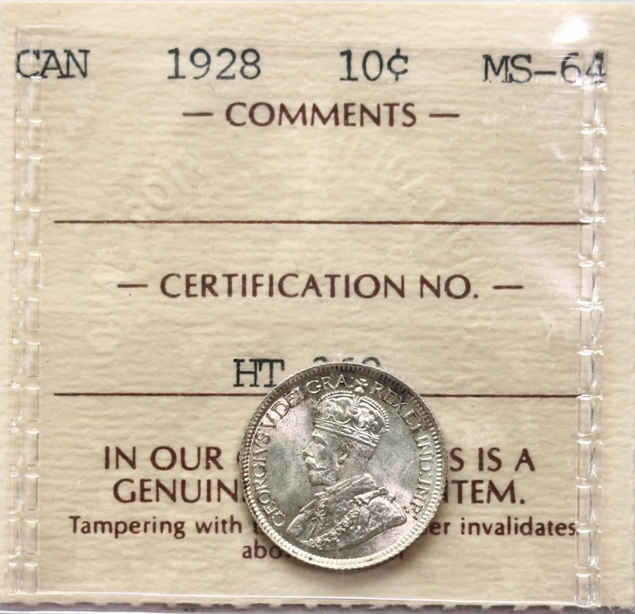 1928 10¢ ICCS Choice Mint State-64 Flashy white example with hint of toning.