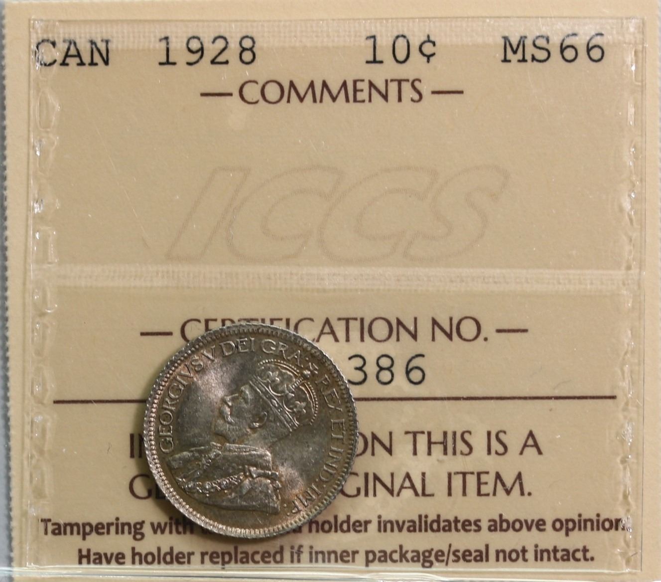 1928 10¢ ICCS Superb Gem Mint State-66, Delicate pink and russet shades over full underlying lustre. A very nice, attractive and superior example.