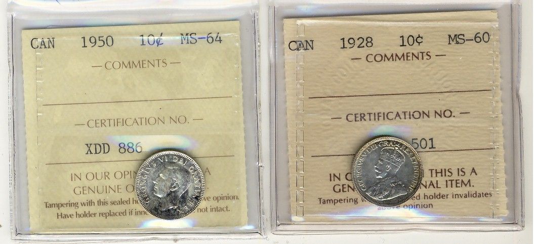 1928 10¢ MS60 & 1950 MS64. Lot of 2 ICCS graded coins.