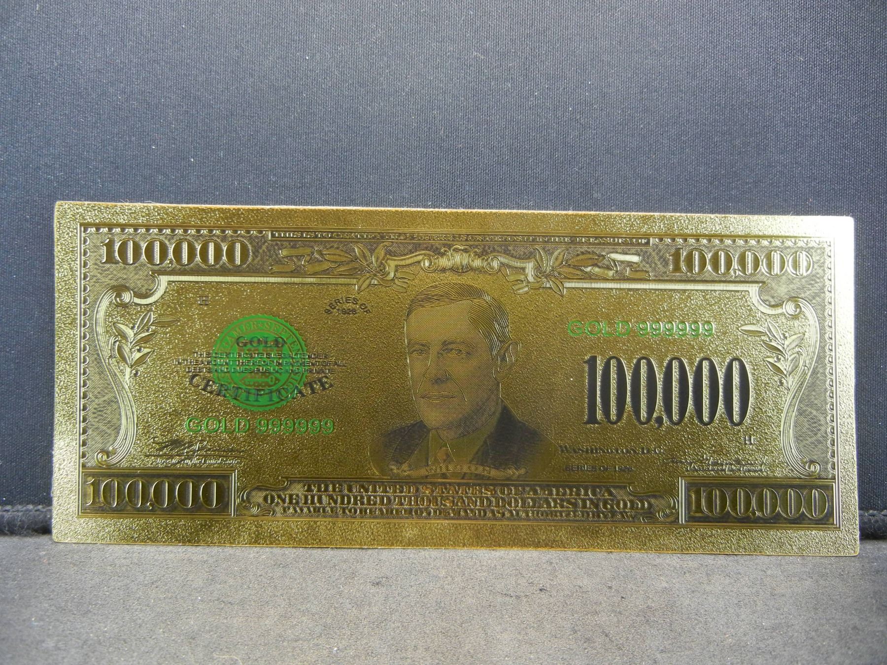 1928 $100,000 Gold Certificate 24K Gold Foil Note NOT LEGAL TENDER