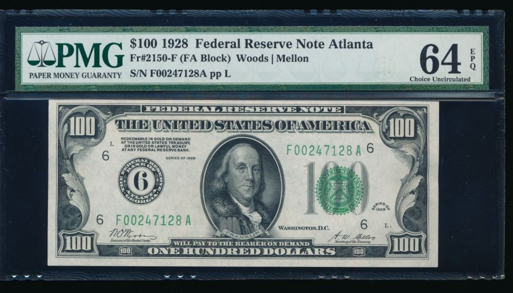 One 1928 $100 Atlanta Federal Reserve Note PMG 64EPQ.