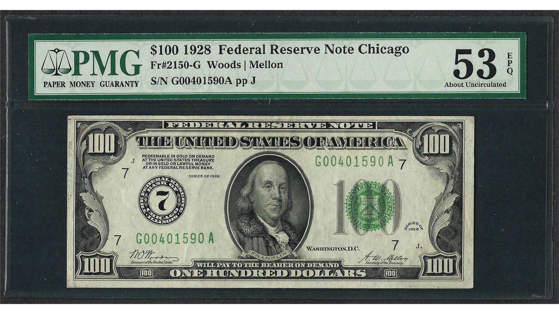 One 1928 $100 Federal Reserve Note Chicago Fr.2150-G PMG About Uncirculated 53EPQ. PMG Certified.
