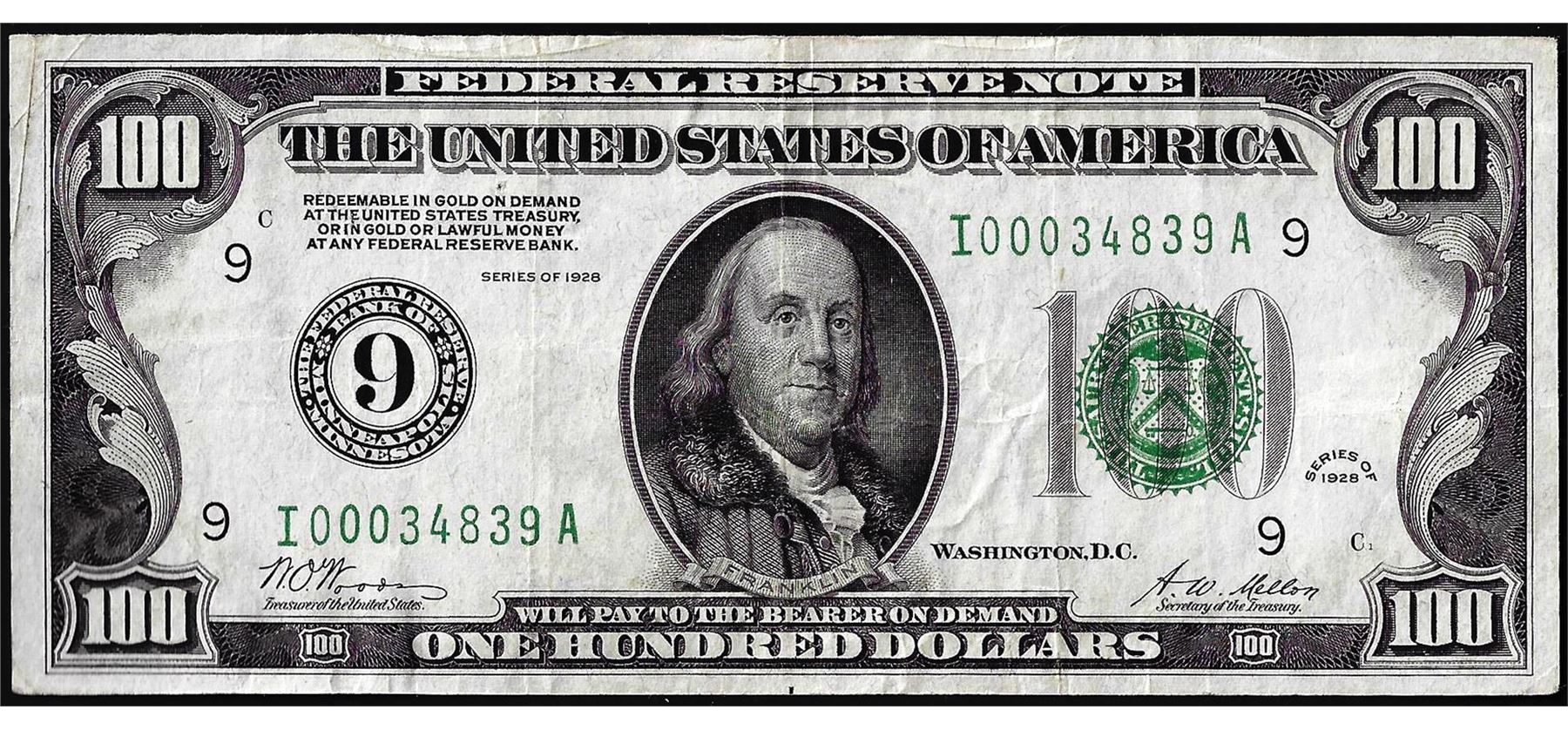 One 1928 $100 Federal Reserve Note Minneapolis Redeemable in Gold.