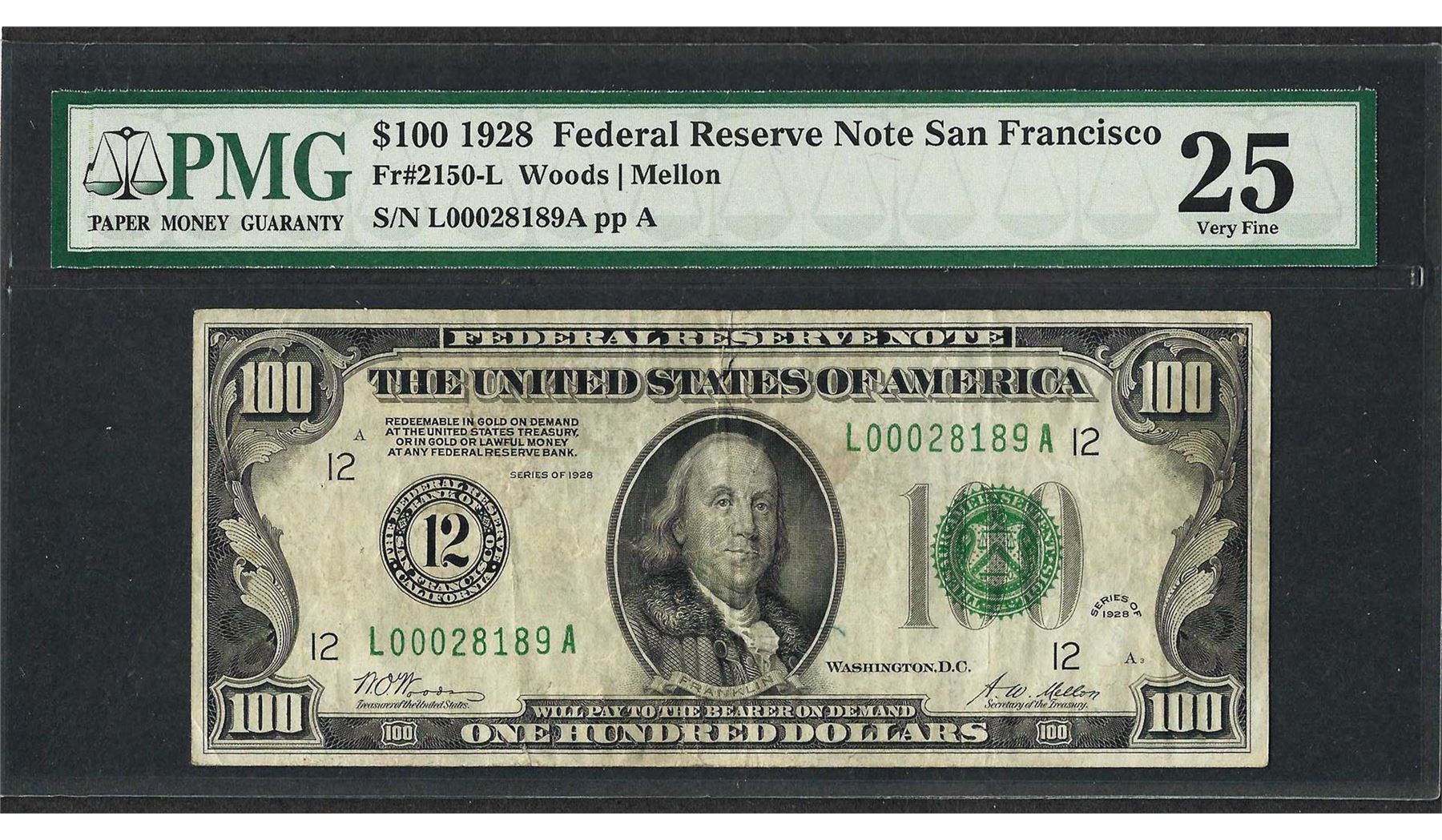 One 1928 $100 Federal Reserve Note San Francisco Fr.2150-L PMG Very Fine 25. PMG Certified.