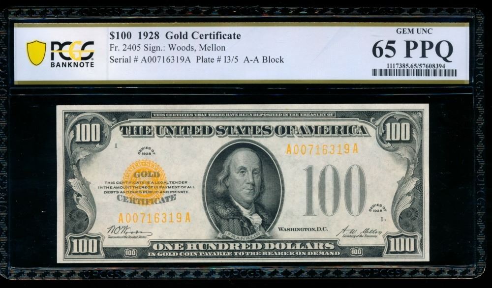 One 1928 $100 Gold Certificate PCGS 65PPQ.