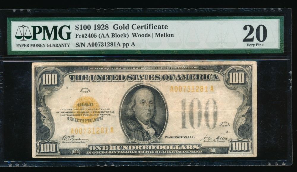 One 1928 $100 Gold Certificate PMG 20.