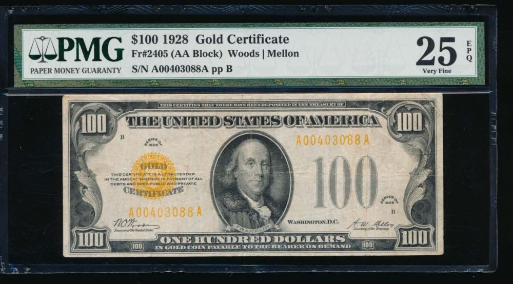 One 1928 $100 Gold Certificate PMG 25EPQ.