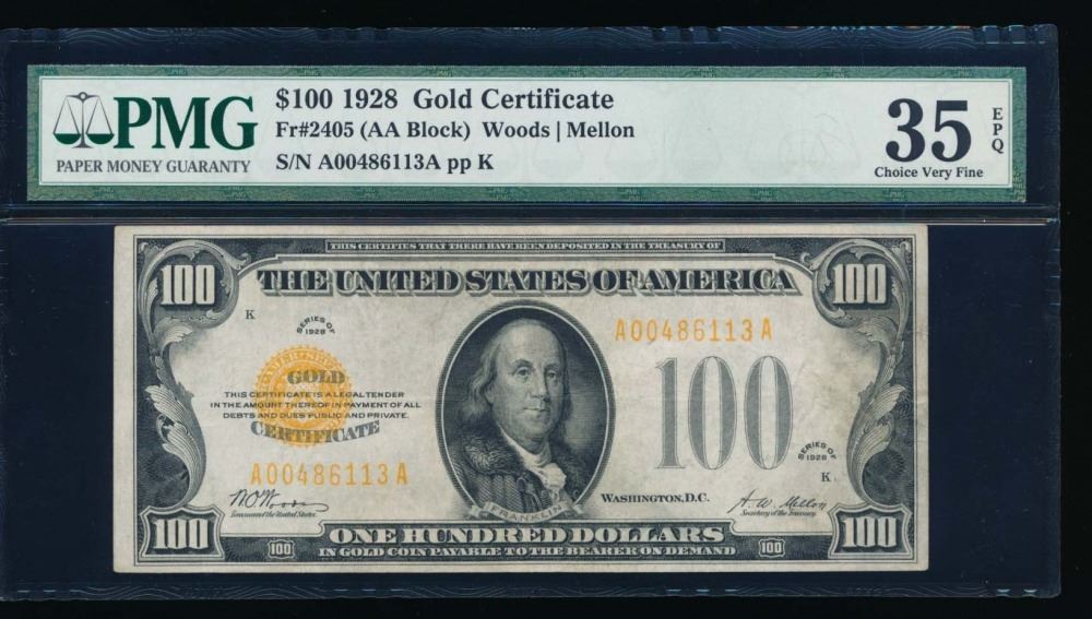 One 1928 $100 Gold Certificate PMG 35EPQ.