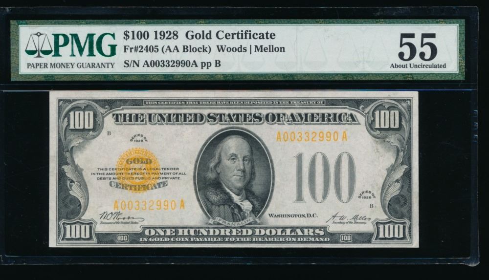 One 1928 $100 Gold Certificate PMG 55.