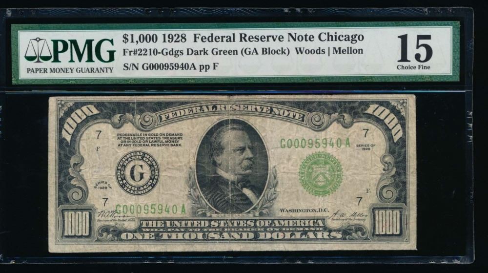 One 1928 $1000 Chicago Federal Reserve Note PMG 15.