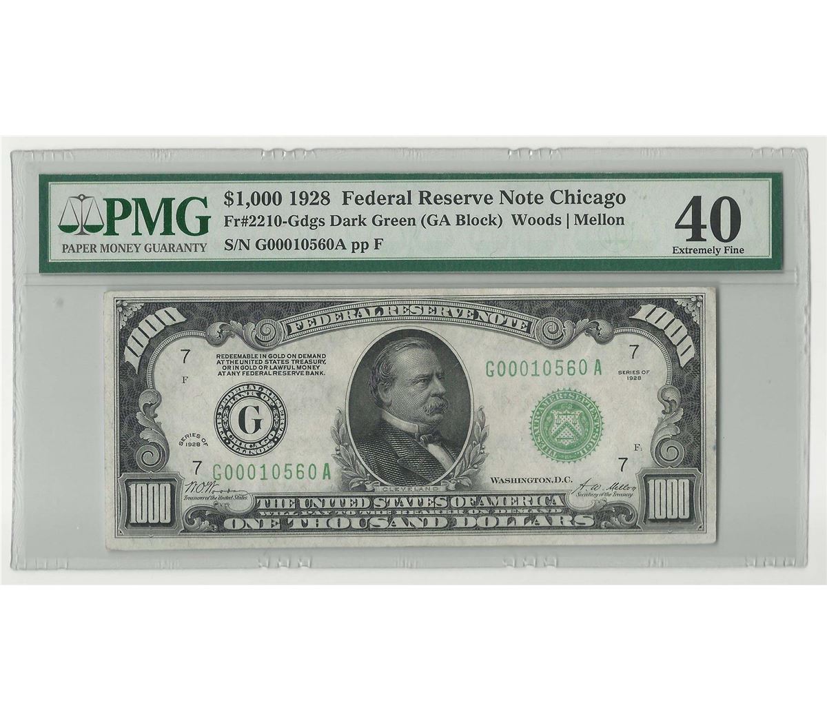 One 1928 $1000 Federal Reserve Note Chicago PMG Extremely Fine 40. PMG Certified.