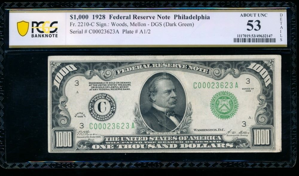 One 1928 $1000 Philadelphia FRN PCGS 53.