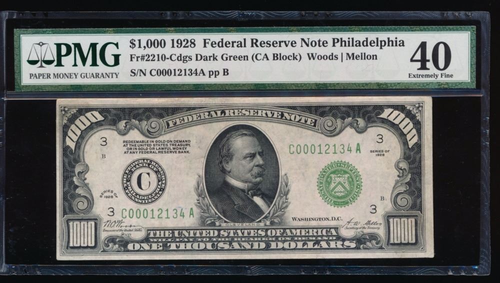 One 1928 $1000 Philadelphia Federal Reserve Note PMG 40.