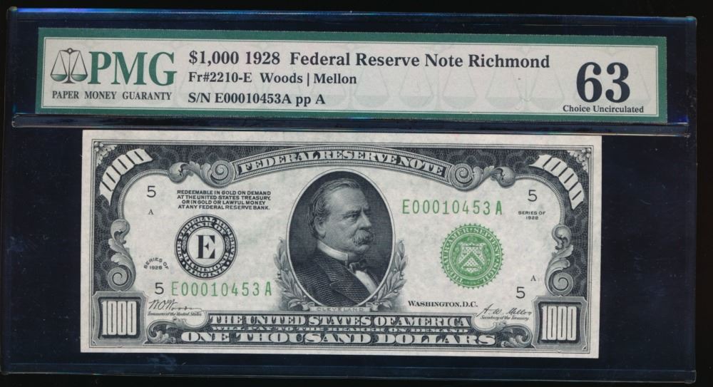 One 1928 $1000 Richmond Federal Reserve Note PMG 63.