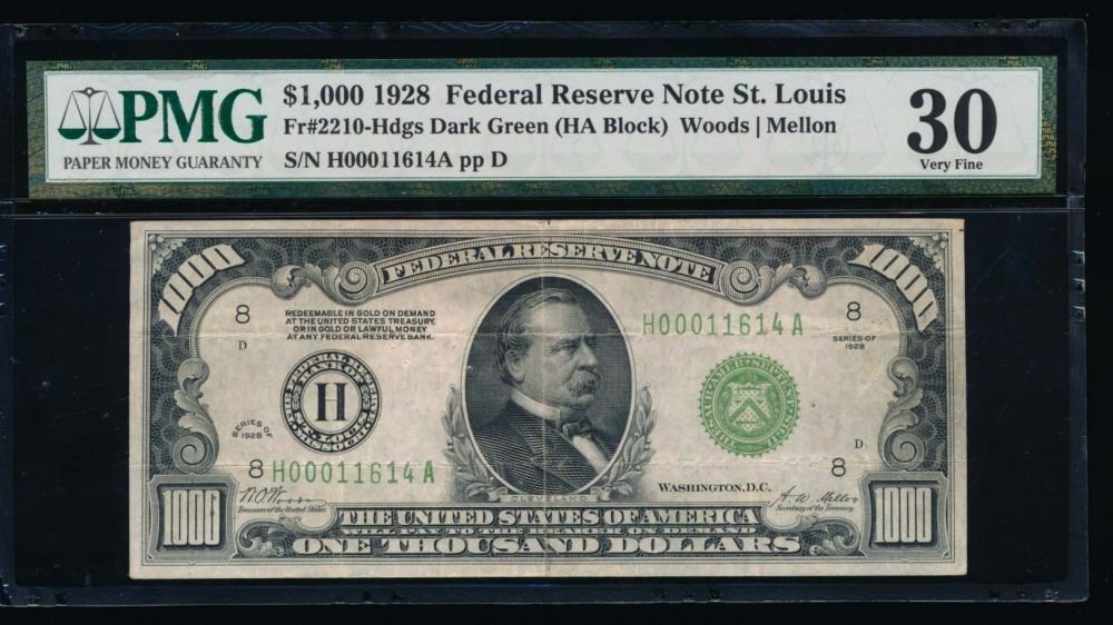 One 1928 $1000 St Louis Federal Reserve Note PMG 30.