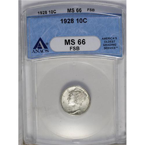 <B>1928<10C> MS66 Full Bands ANACS.</B></I> This sharp Premium Gem exhibits silver-gray, lustrous surfaces and crisply defined devices. A small mark at Mercury's temple is not bothersome.