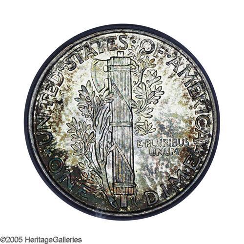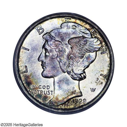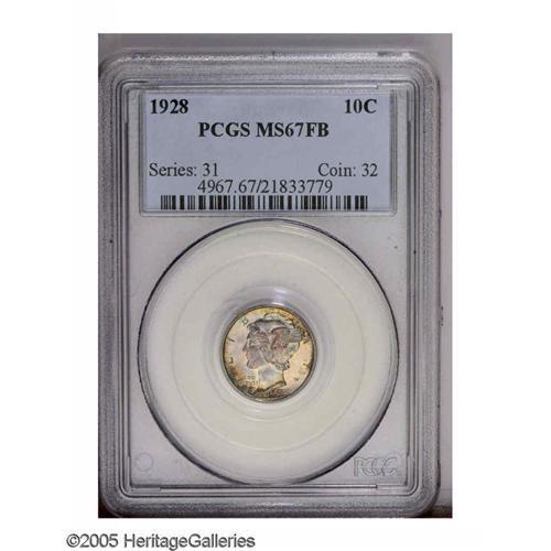 <B>1928<10C> MS67 Full Bands PCGS.</B></I> With more than 19 million pieces struck, the 1928 is not a scarce issue in the absolute sense. However, as one might imagine with any coin from the 1920s, it is seldom seen in Superb condition. This is a stunning, heavily frosted dime that is covered with indigo, rose, and golden colors on the obverse, and golden-gray patina on the reverse. Virtually perfect from a technical standpoint. Population: 18 in 67, 0 finer (11/05).