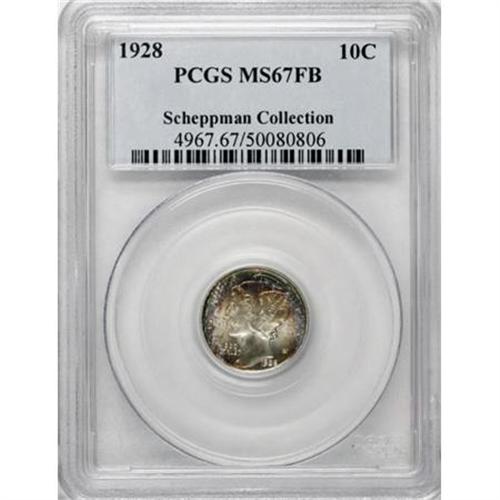 <B>1928 10C MS67 Full Bands PCGS.</B></I> Sharply struck with vibrant luster and magnificent preservation. Violet, blue, and tan shadings frame the brilliant centers on this Philadelphia piece. Population: 24 in 67 Full Bands, 0 finer (12/07).<BR><I>From The Scheppman Collection, #4 PCGS Registry of Full Band Mercury Dimes.</B></I><BR><BR><B>Coin Engraver:</B> Adolph A. Weinman<BR><BR><b>Shipping:</b> Coins & Currency (<a target="_blank" href="http://www.heritageauctions.com/common/shipping.php">view shipping information</a>)