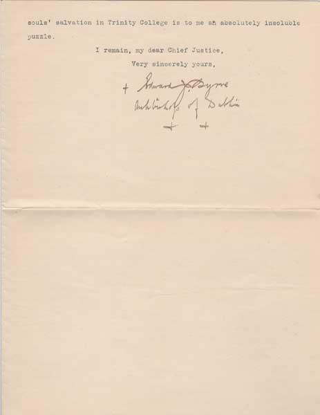 1928 (14 May). Archbishop Edward Byrne letter to Chief Justice Hugh Kennedy regarding Trinitry College - "still an institution to which a Catholic can go only at grave peril to his Faith"