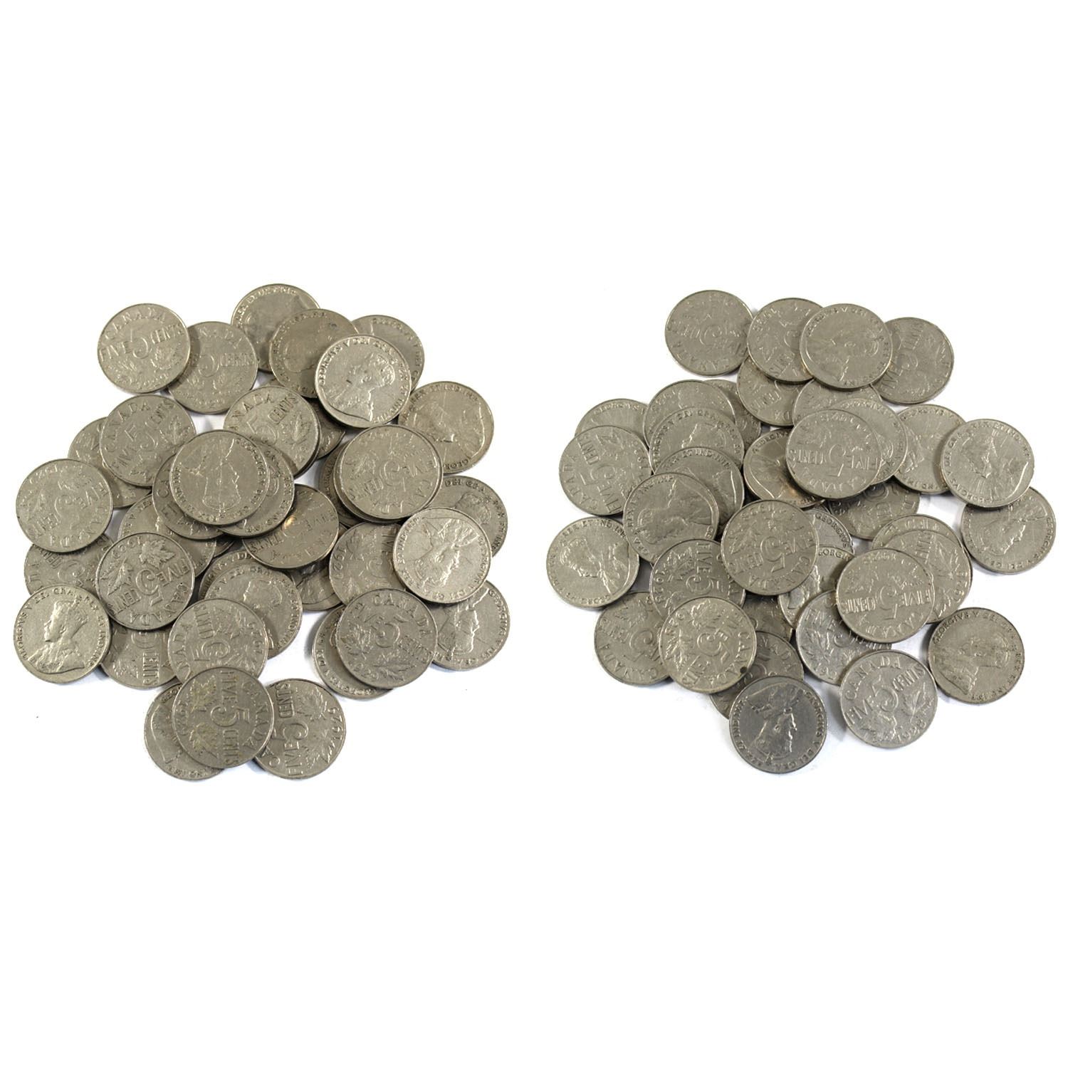 1928 & 1929 Canada George V 5-cent Rolls of 40pcs in Circulated Condition. 80pcs total.