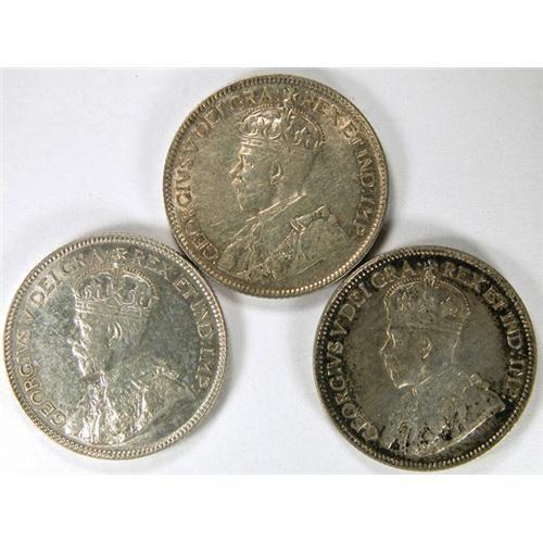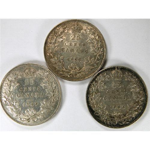 Canada Twenty-Five Cents 1928, 1929 and 1932. Three pale toned to lightly toned pieces, all EF