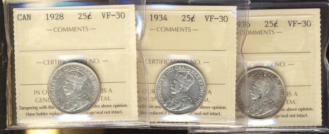 1928, 1934, 1936 25¢ all ICCS VF30, Lot of 3 coins,