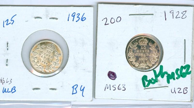 1928 & 1936 10¢. Lot of 2 coins both lustrous MS62.