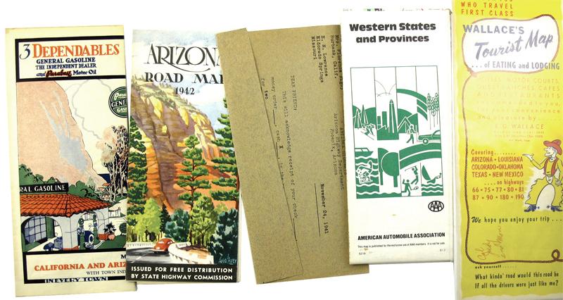 Lots of 12 maps and tourist information. 1)Cal, , Az, Nv- 1928. 2) Boulder Dam Country- 1929. 3) Arizona - 1942. 4)Western States - AAA -1981. 5) US 54 -1950's. 6) Wallace's Tourists Map - 1950's, off southwest. 7) New York City - 1940's. 8) New York City - 1950. 9) Texas - 1956. 10) Santa Fe, NM- 1956. 11&12) Gas Watchers Guide - AAA - 1975.
